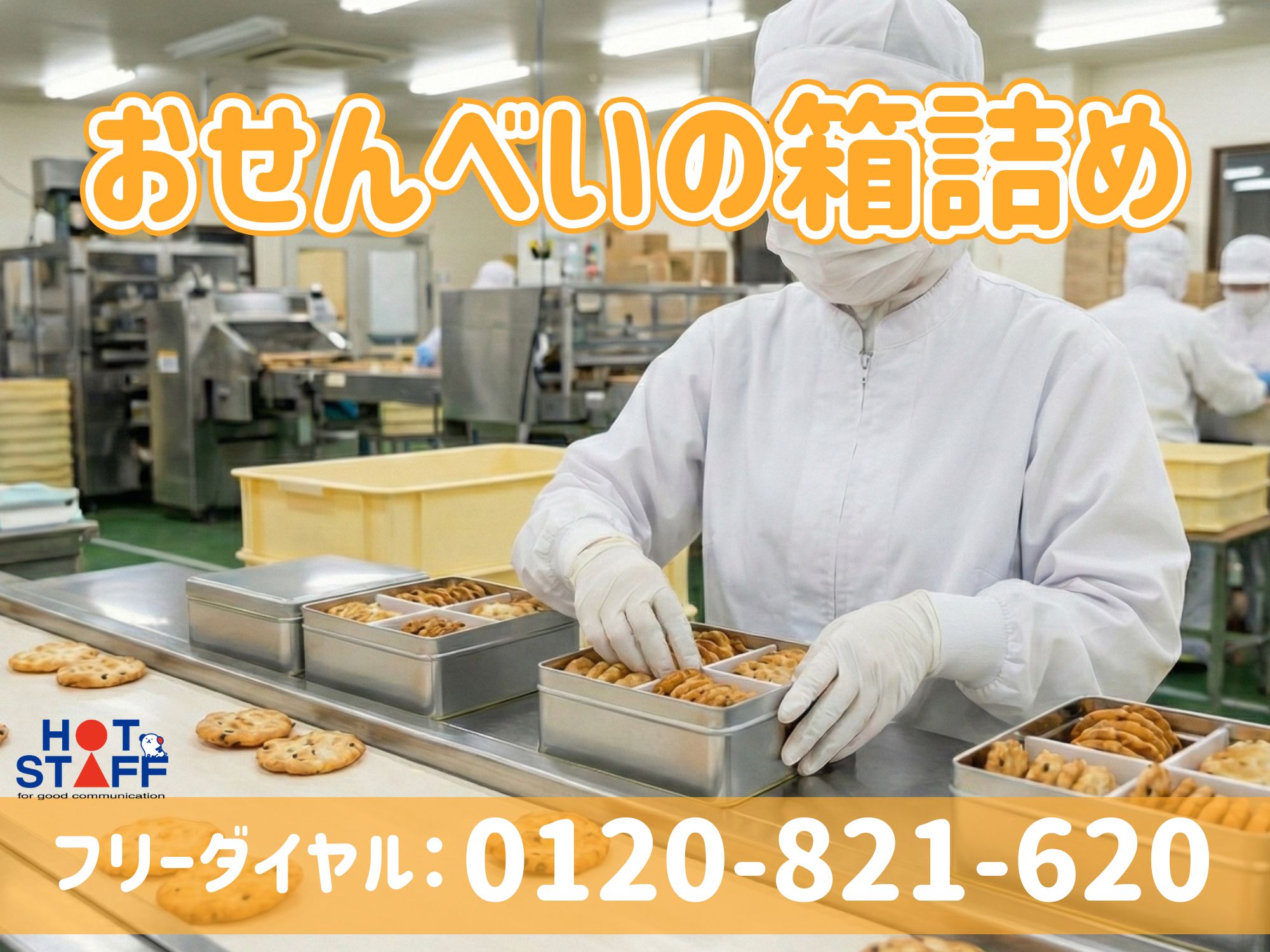 【残業ナシで定時で帰れる♪】日勤・土日休み/パリッと軽い『おせんべい』を箱に入れるだけ〈直方市〉