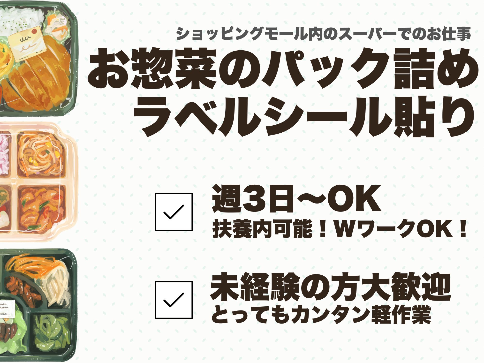 未経験OK/簡単軽作業/シフト制/駅チカで通勤ラクラク/扶養内可能/お惣菜のパック詰め