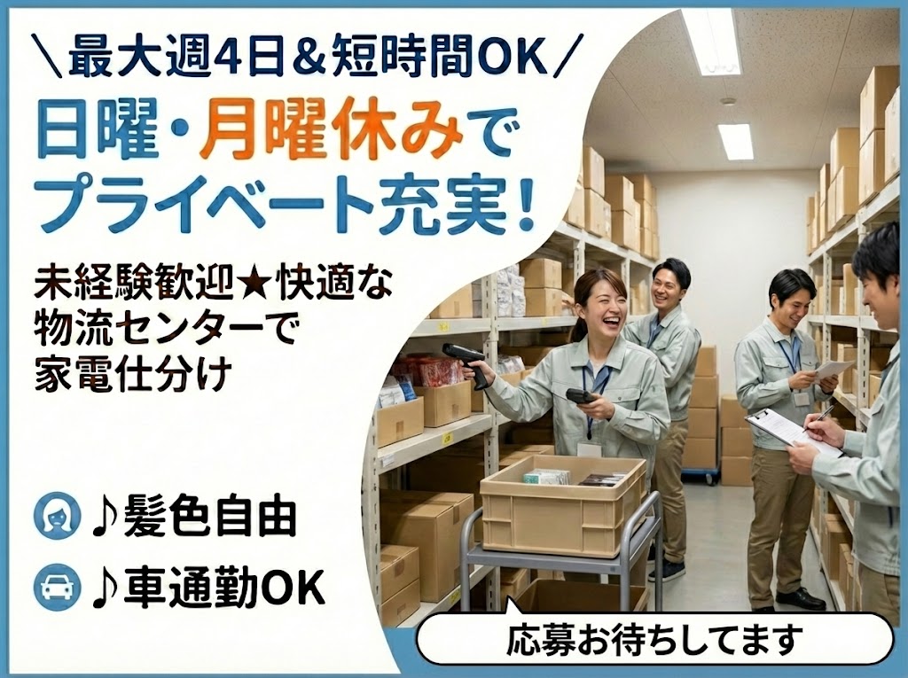 家電商品の仕分け&簡単検品│日勤パート・週3日~OK!│未経験者歓迎★│日・月固定休み♪