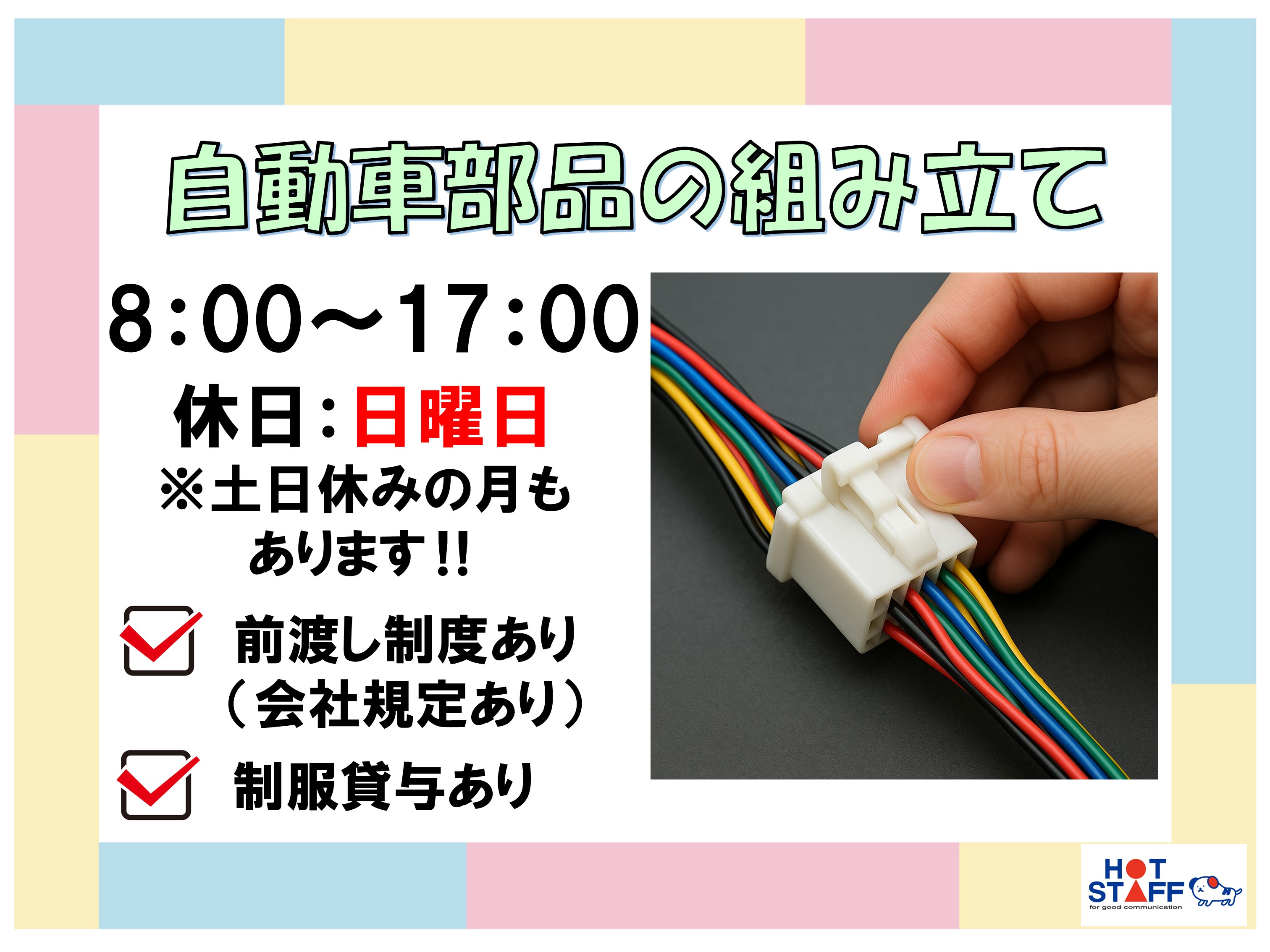 稼げるお仕事・週6勤務で日曜休み・自動車部品の組立・組付業務・4つの工程から自分に合った作業を専業でお願いします