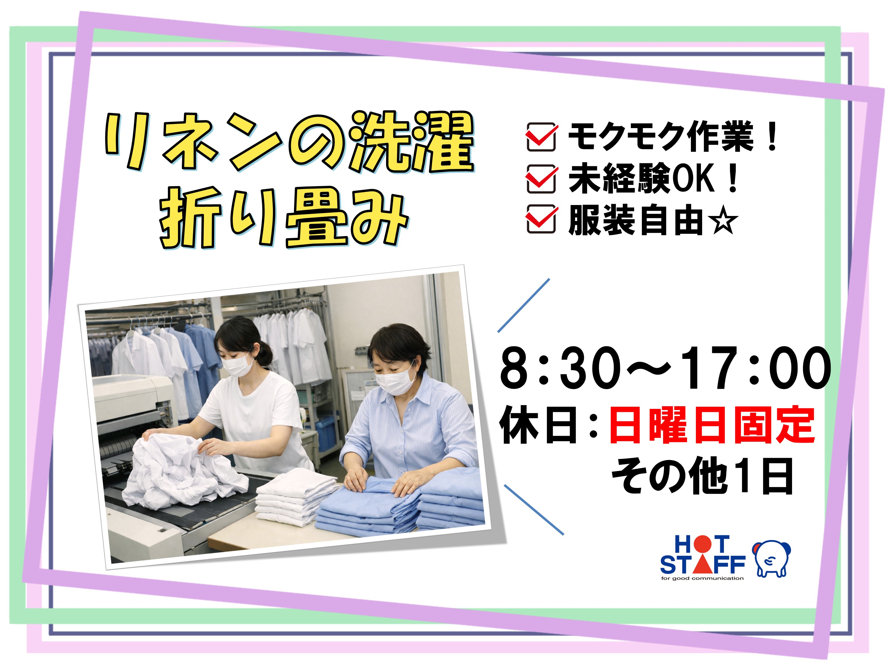 赤江×リネンの折り畳み作業/簡単軽作業☆未経験OK!無料駐車場完備!日曜+平日休み♪即日払いOK!