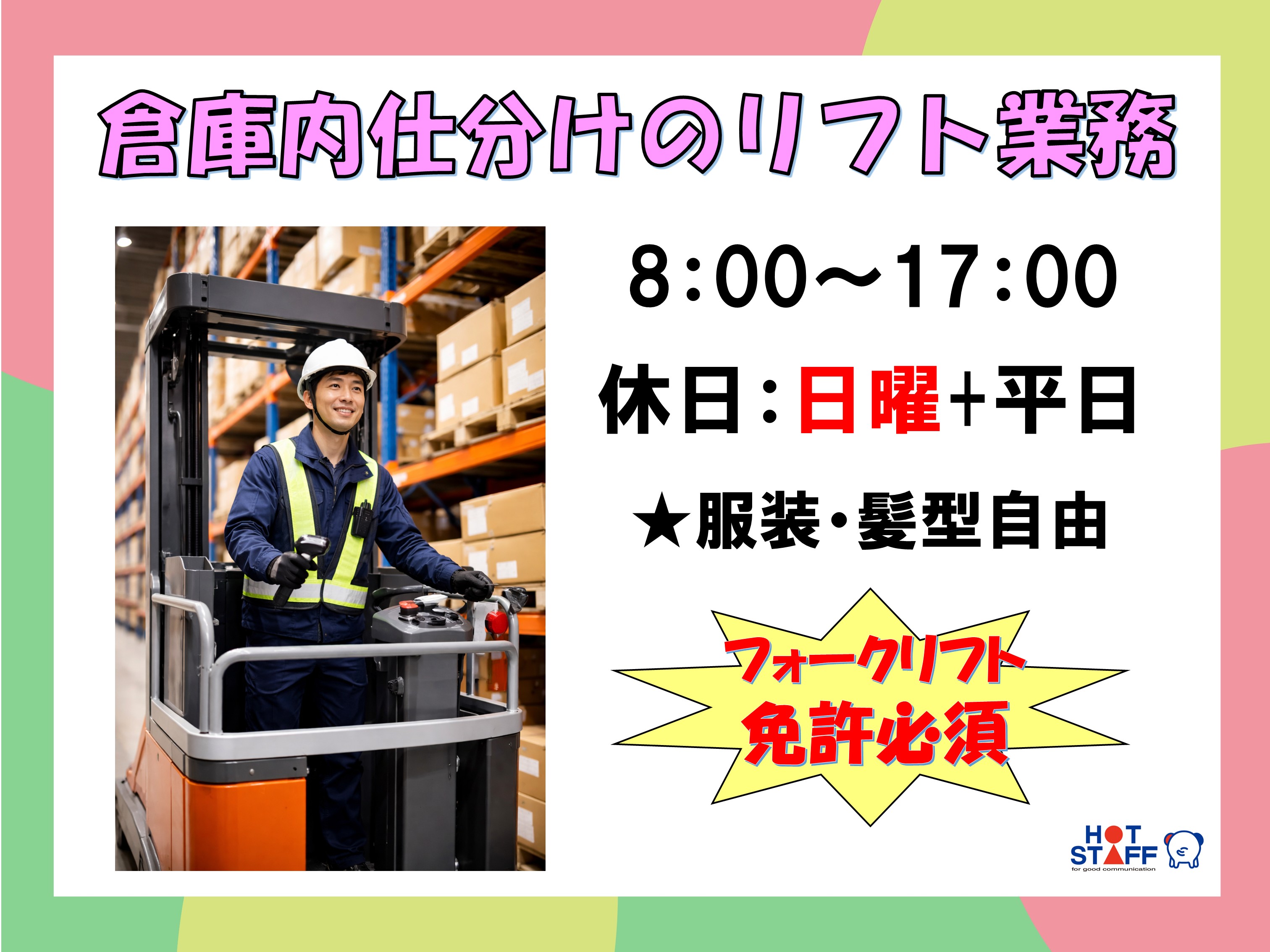 急募!!リフト免許必須・倉庫内作業・日勤でも夜勤でもOK・経験が活かせるお仕事