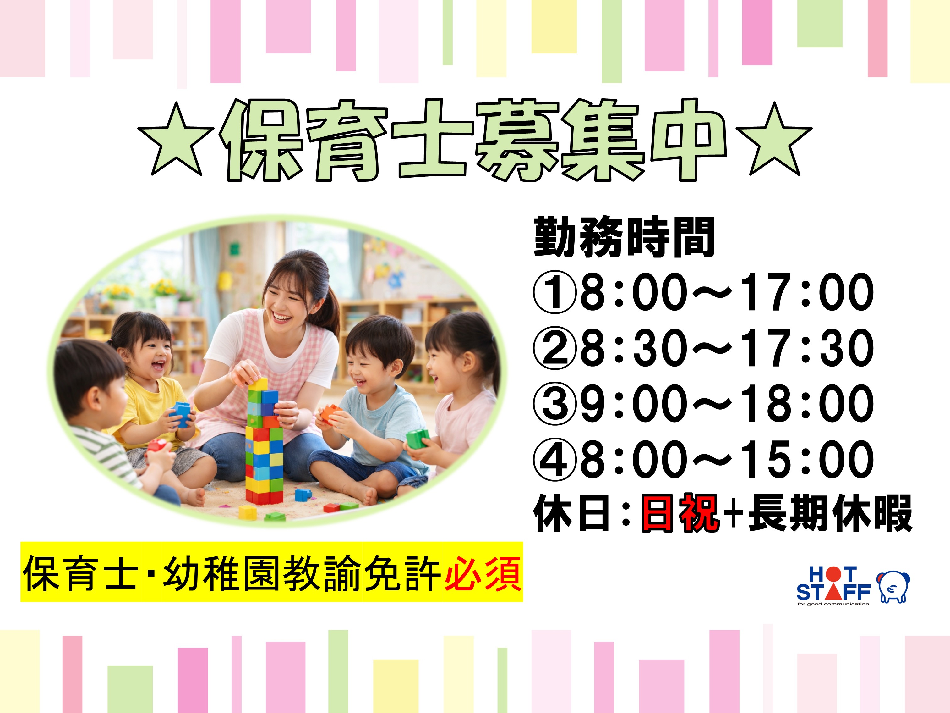 日祝休みで充実!笑顔あふれる幼保連携型こども園・身の回りのお世話中心・資格必須