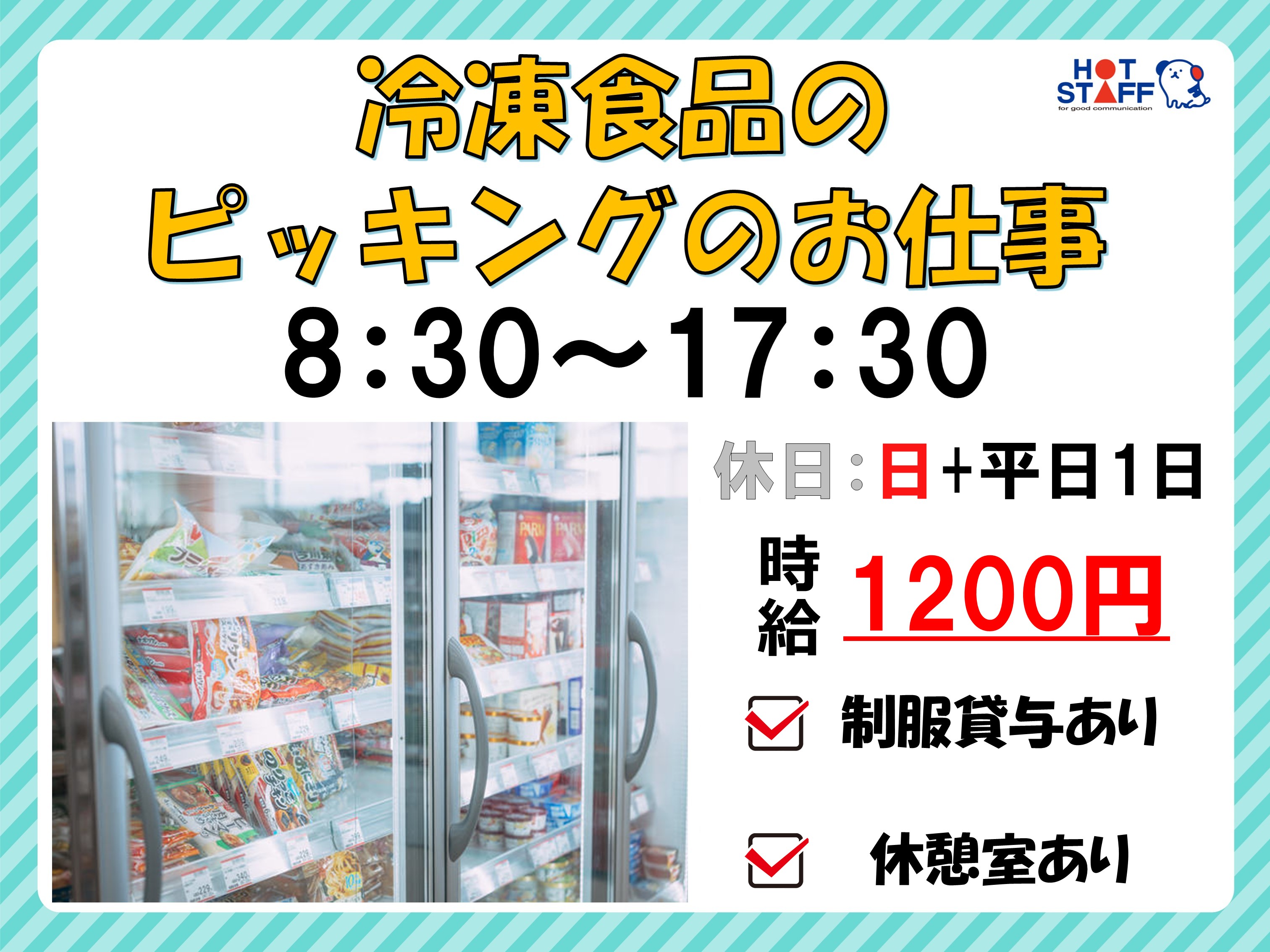 高時給・商品管理スタッフ・冷凍食品の仕分け・日曜日固定休み・防寒服貸与あり