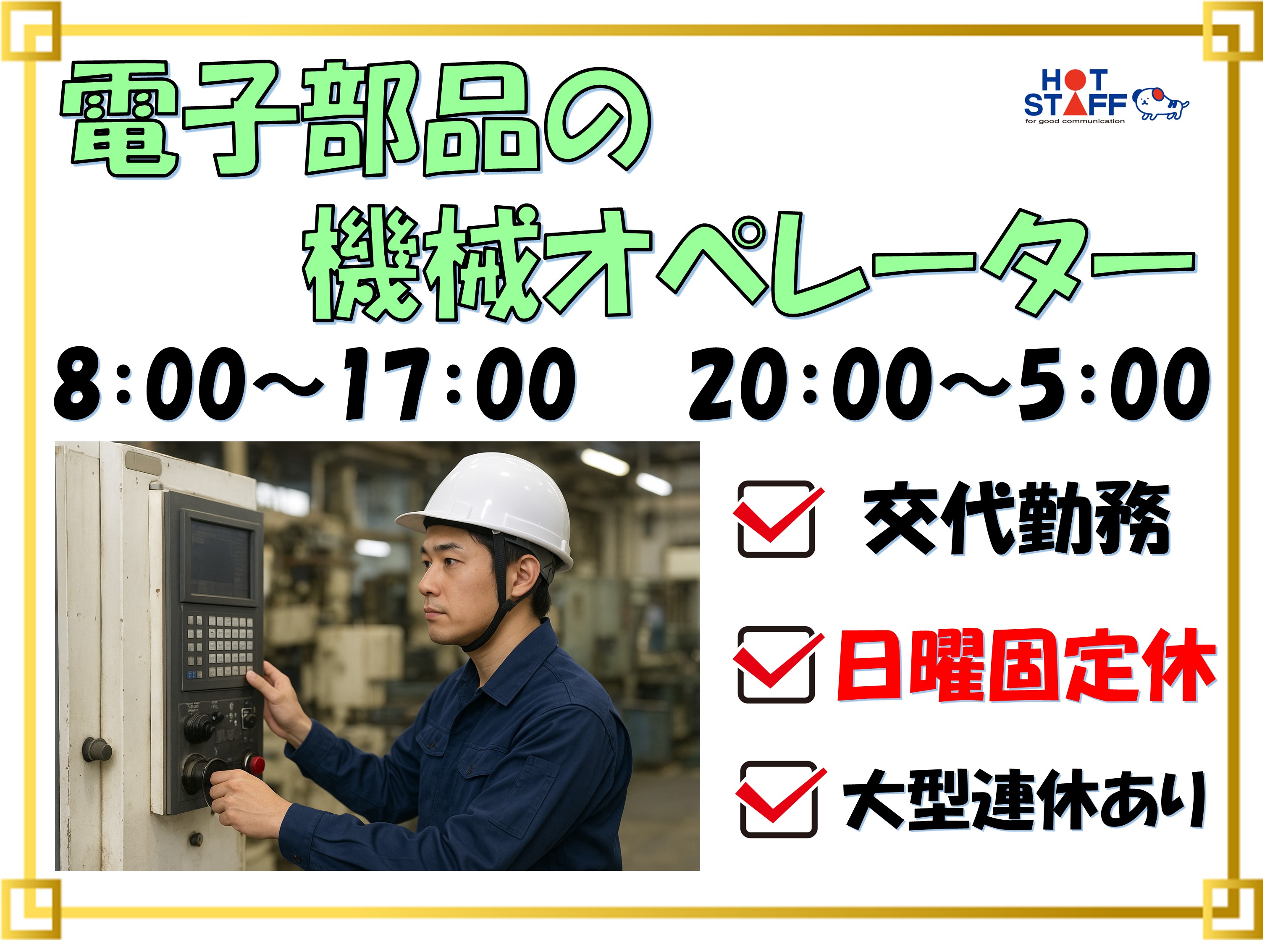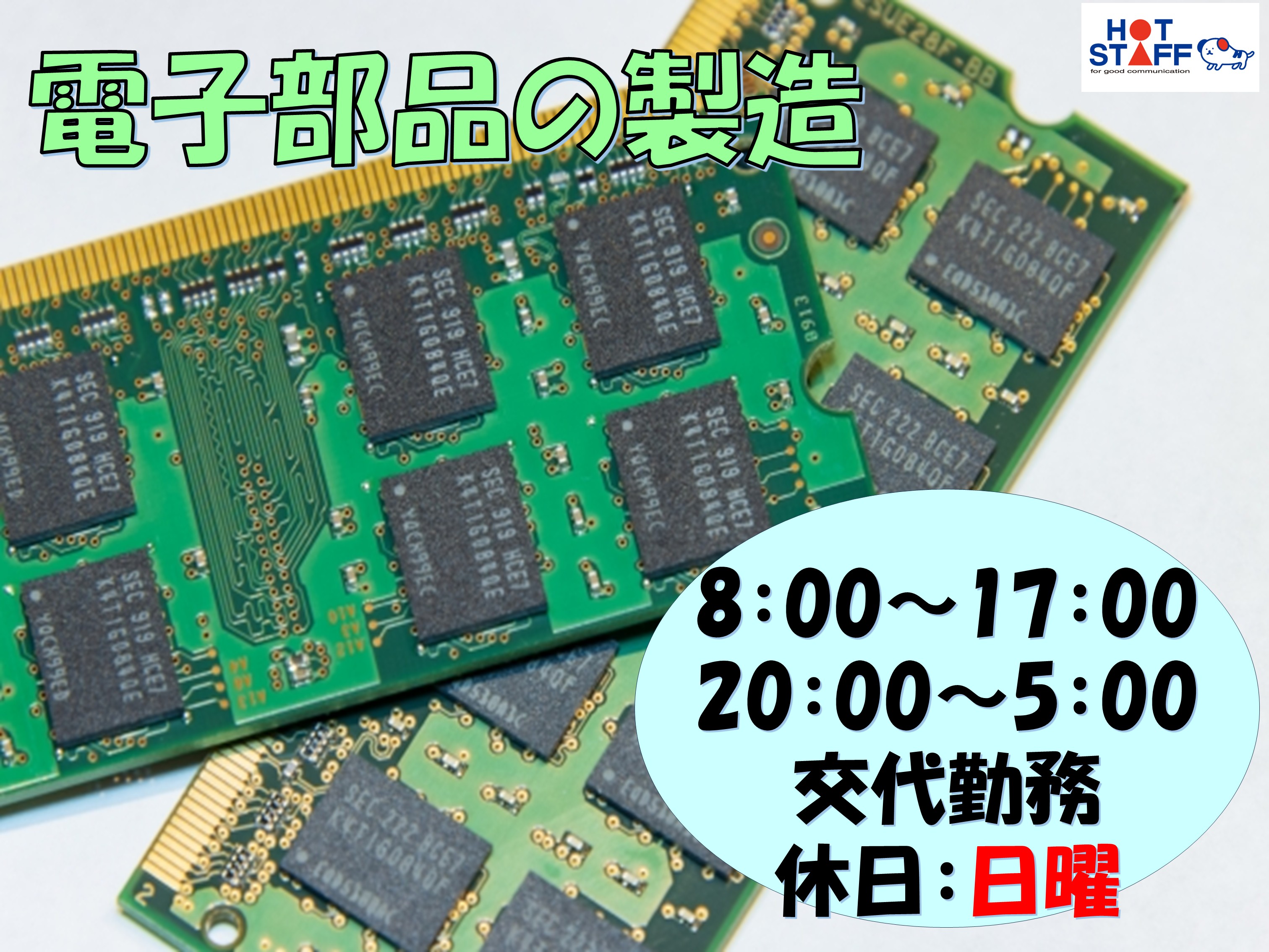 昼夜交代勤務・電子部品の製造・日曜日固定休み・未経験でもOK・嬉しい空調完備!