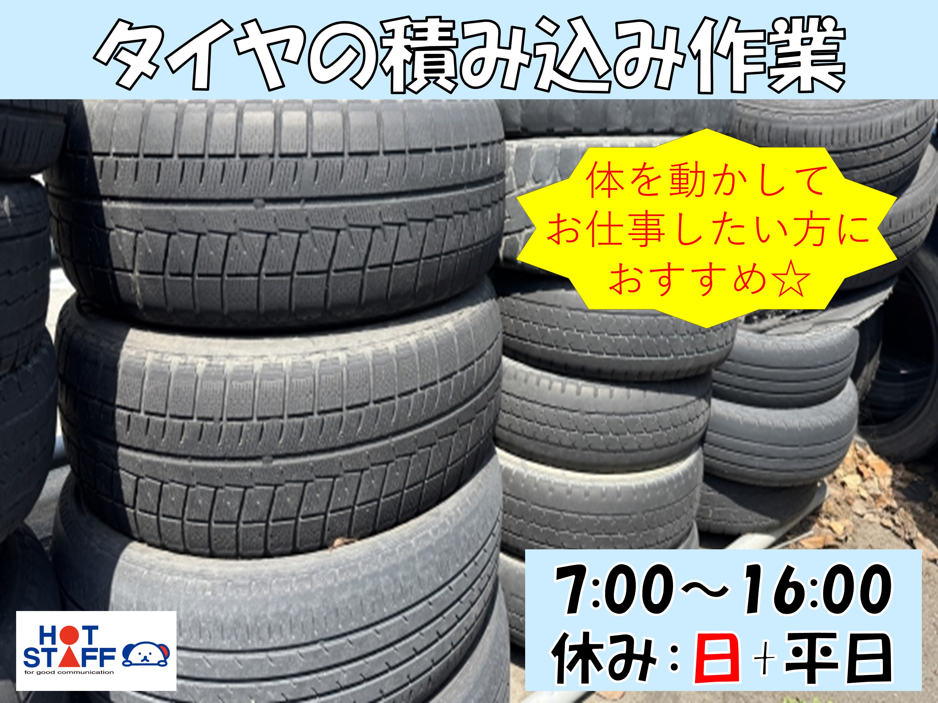 タイヤの積み込み作業・日曜+平日1日お休み・体を動かして仕事したい方におすすめです。