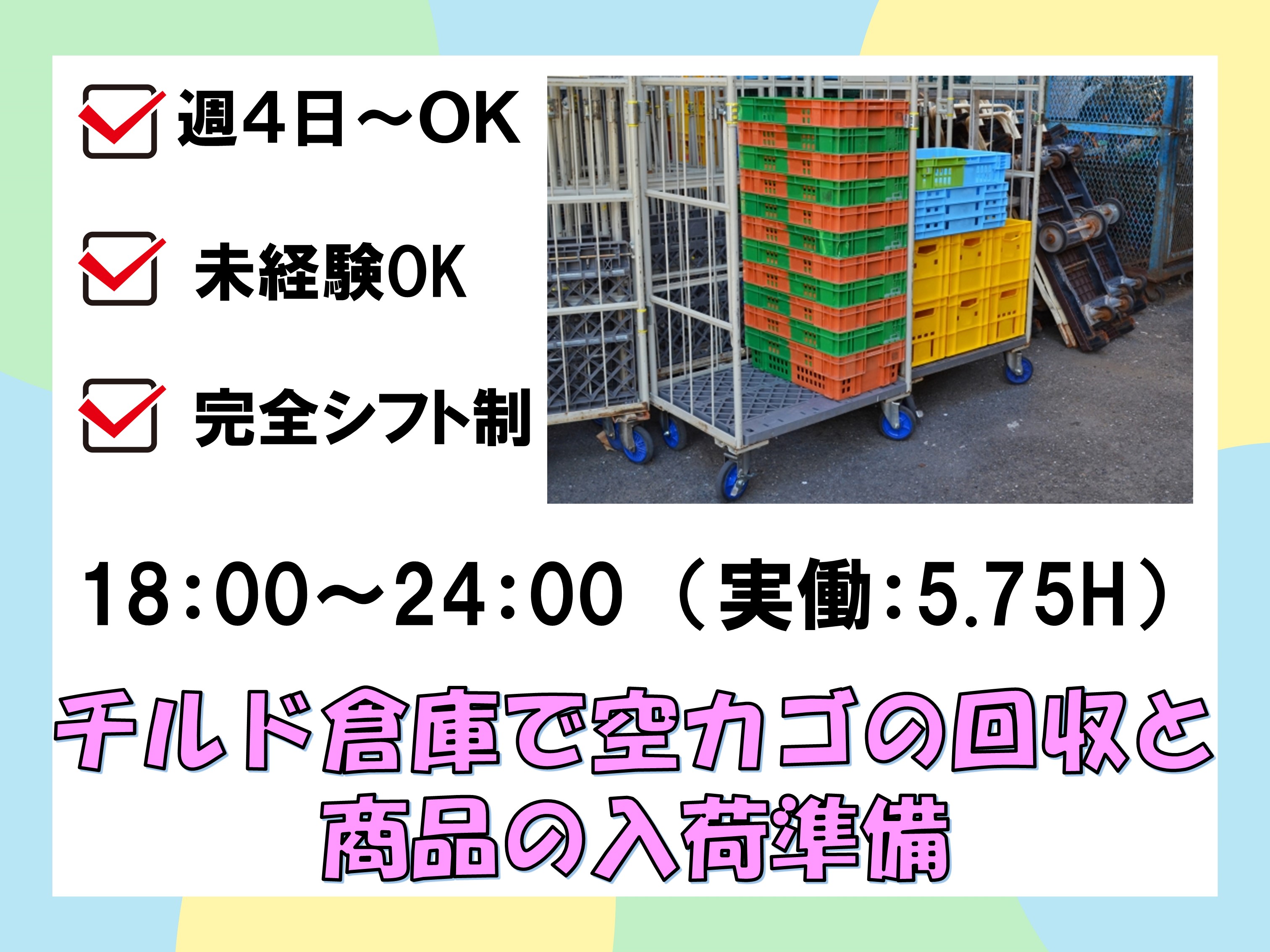 夜勤・チルド物流倉庫で空カゴの回収と商品の入荷準備・週4日~OK・完全シフト制