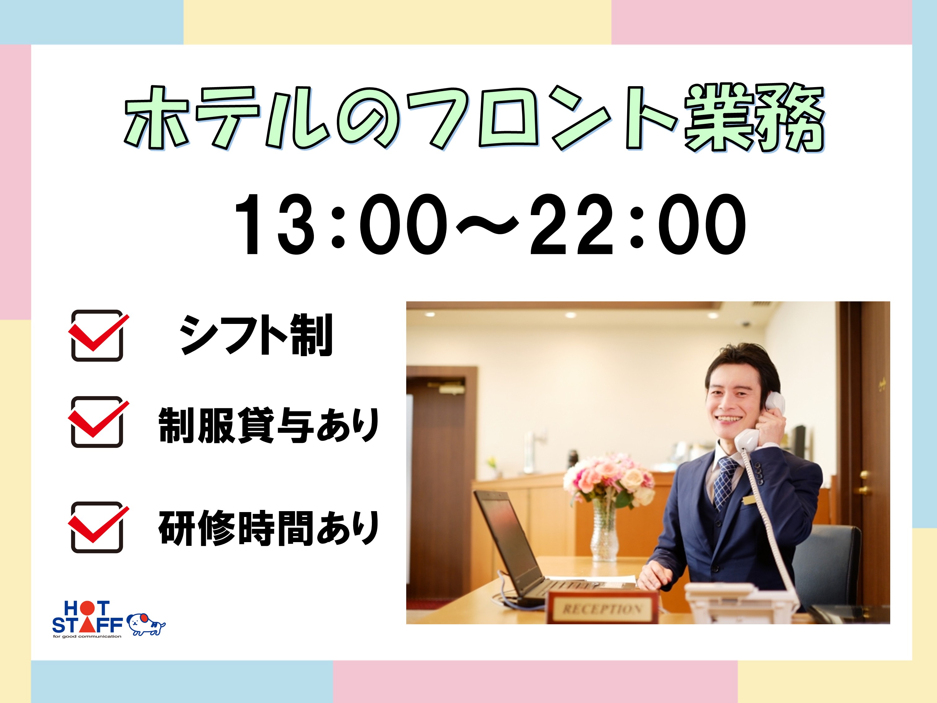 ホテルのフロントや清掃業務・完全シフト制・研修制度あり・空調完備