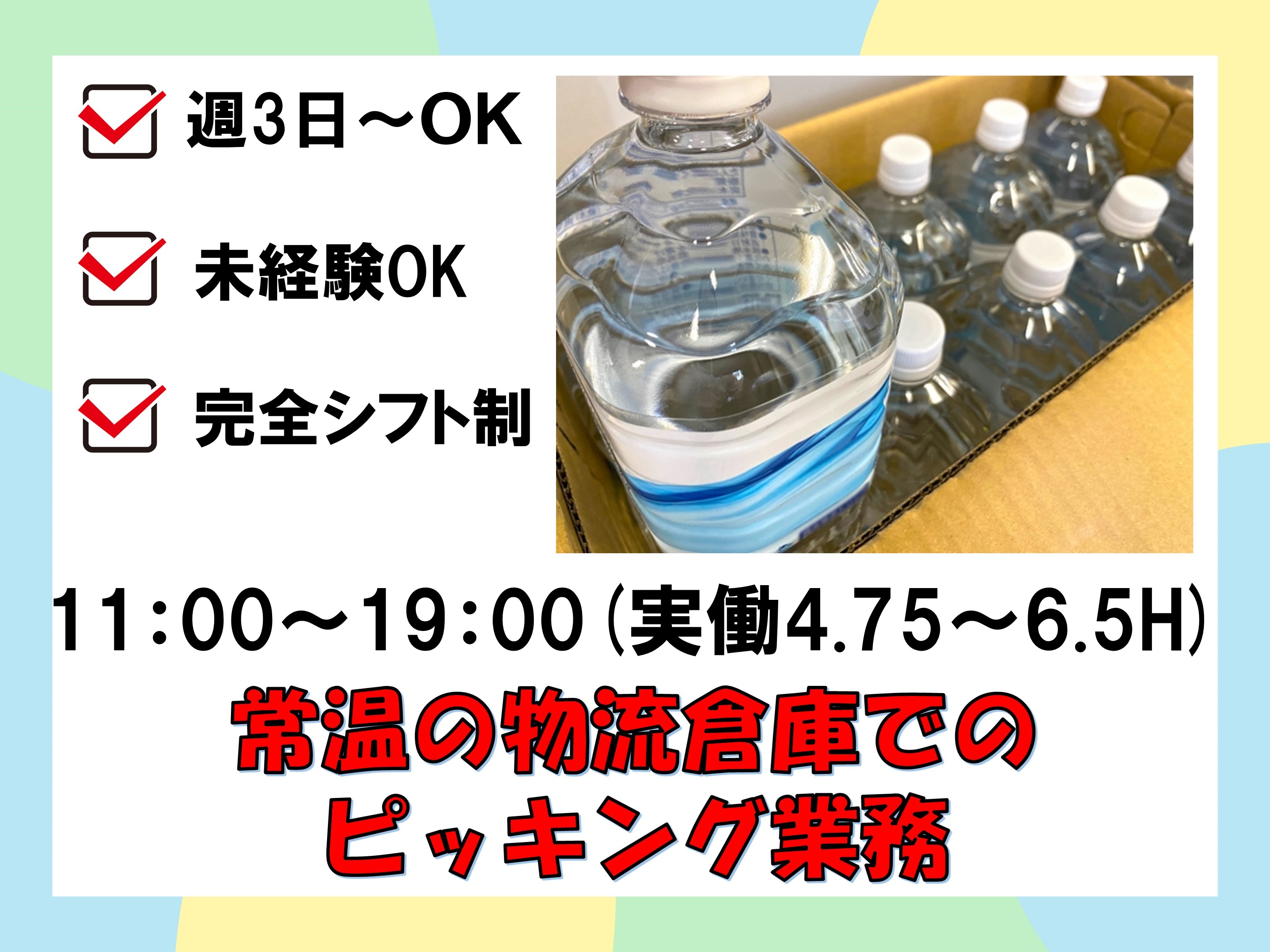 常温倉庫内で飲料水ケースやインスタント食品の仕分け・11時スタートなので朝ゆっくり派のあなたに♪