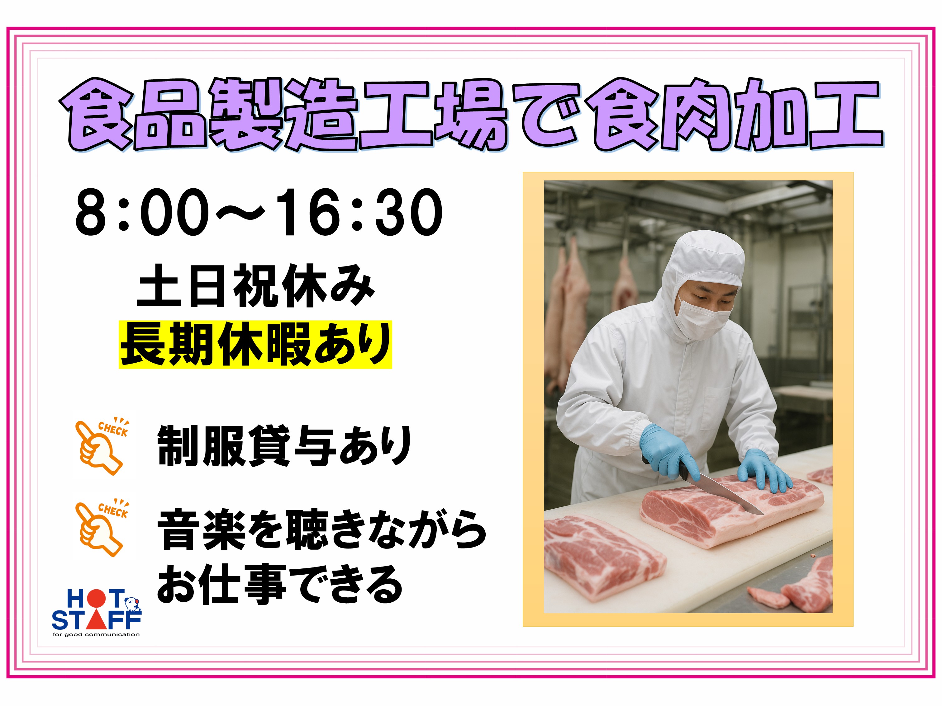 食品製造のお仕事・豚肉のカット・土日祝休み・制服貸与・音楽を聴きながらお仕事できます