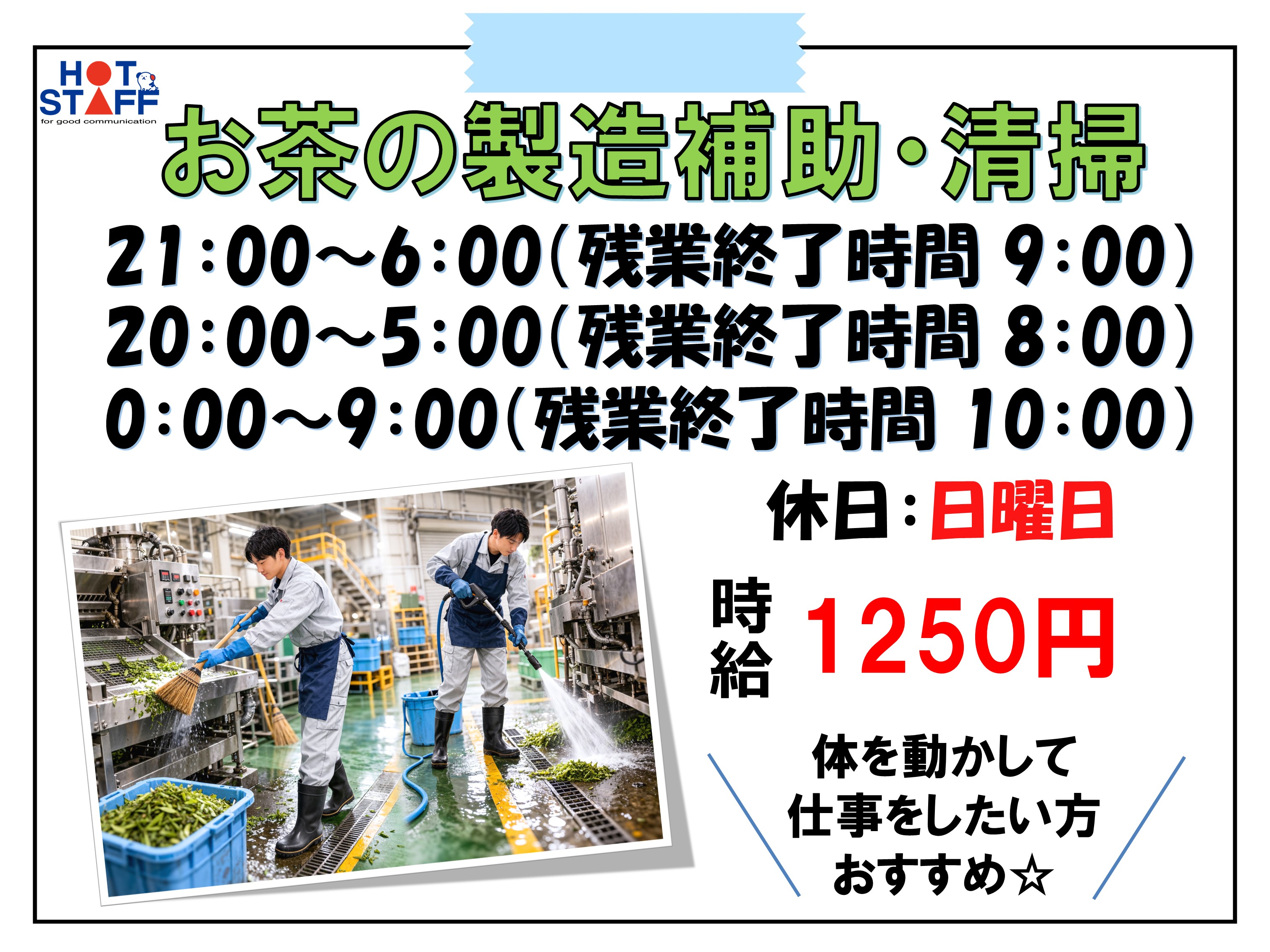 高時給!短期4月〜11月・夜勤専属・お茶製造工場の梱包・清掃・未経験歓迎