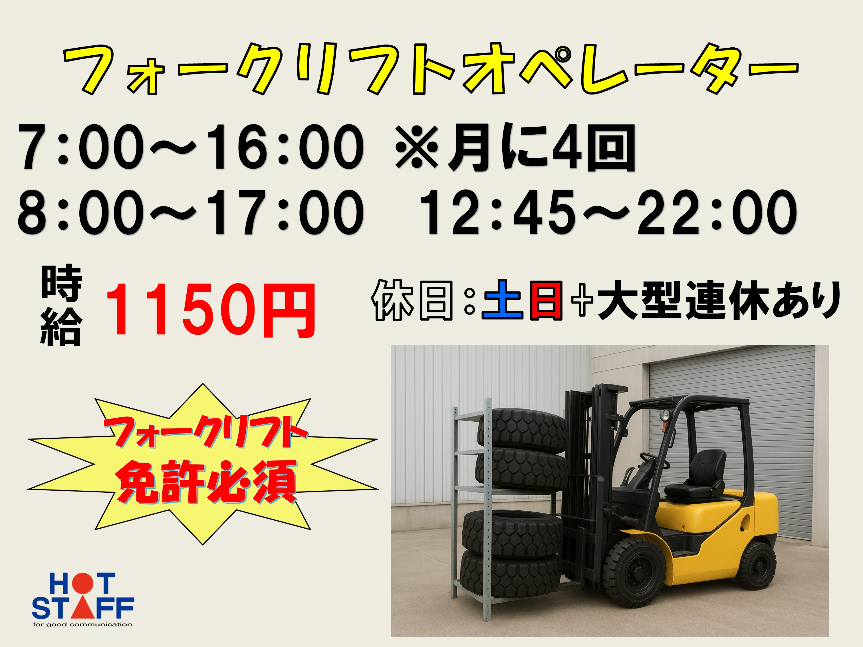 リフト免許必須・タイヤ移動のフォークリフト業務・大型連休もあり・制服貸与有