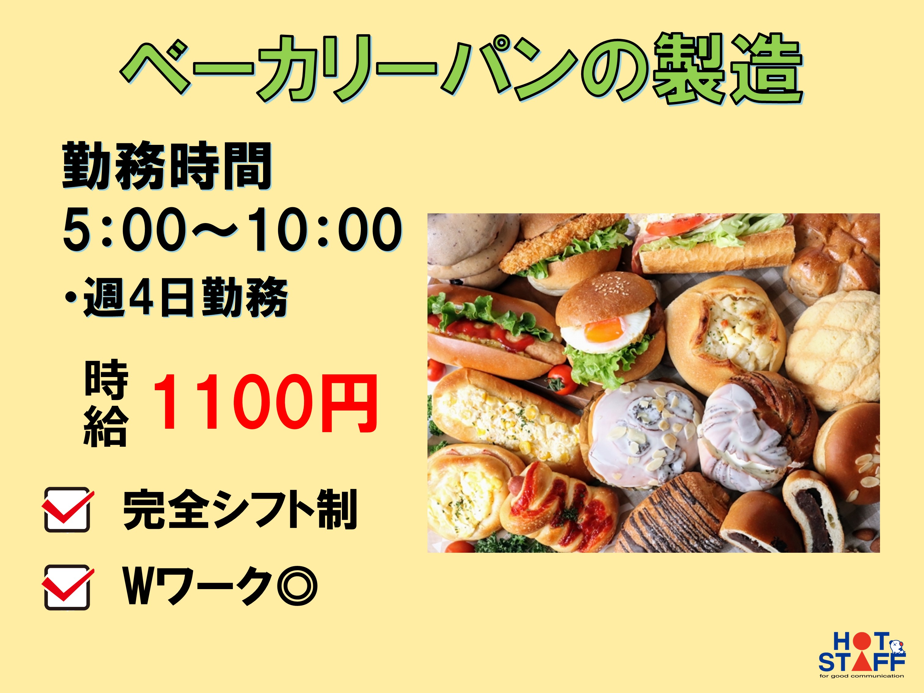 Wワークや副業にも!早朝パン製造&サンドイッチ作り・週4日勤務・未経験OK