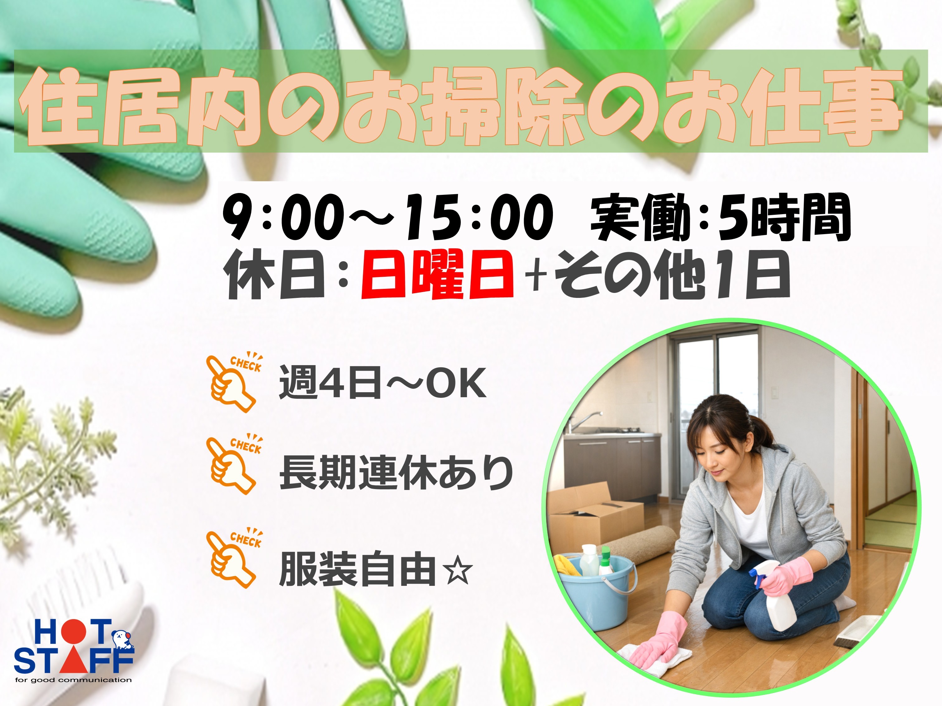 お部屋や水回りなど住居内の清掃・週4日~OK・日曜日固定お休み・体を動かしながら働ける!