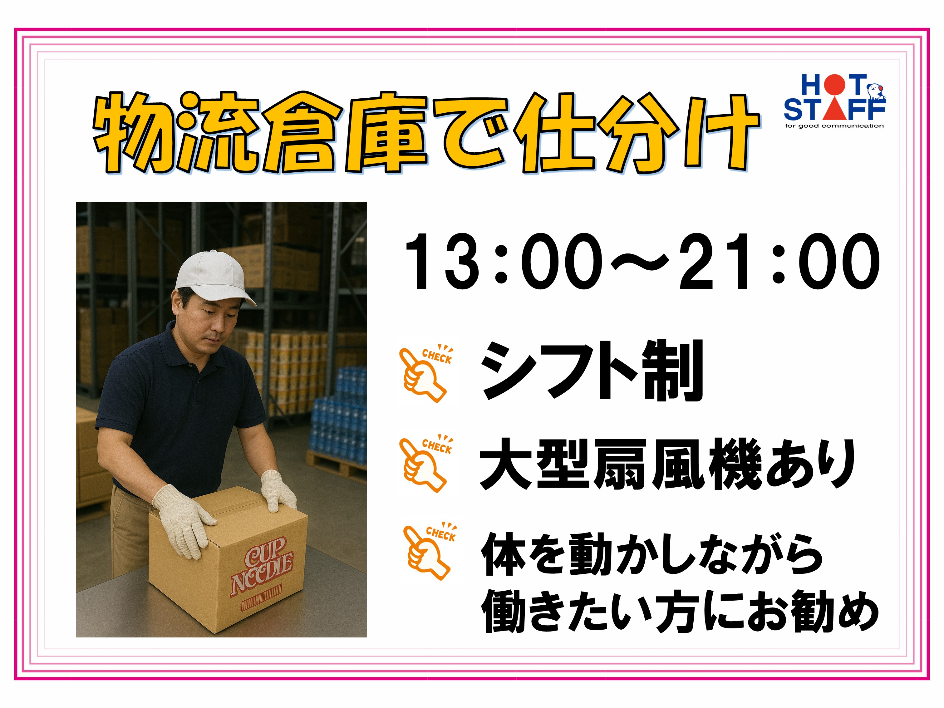 ドラックストア商品の仕分け・常温倉庫内作業・朝はゆっくり13時スタート・風通しの良い職場!