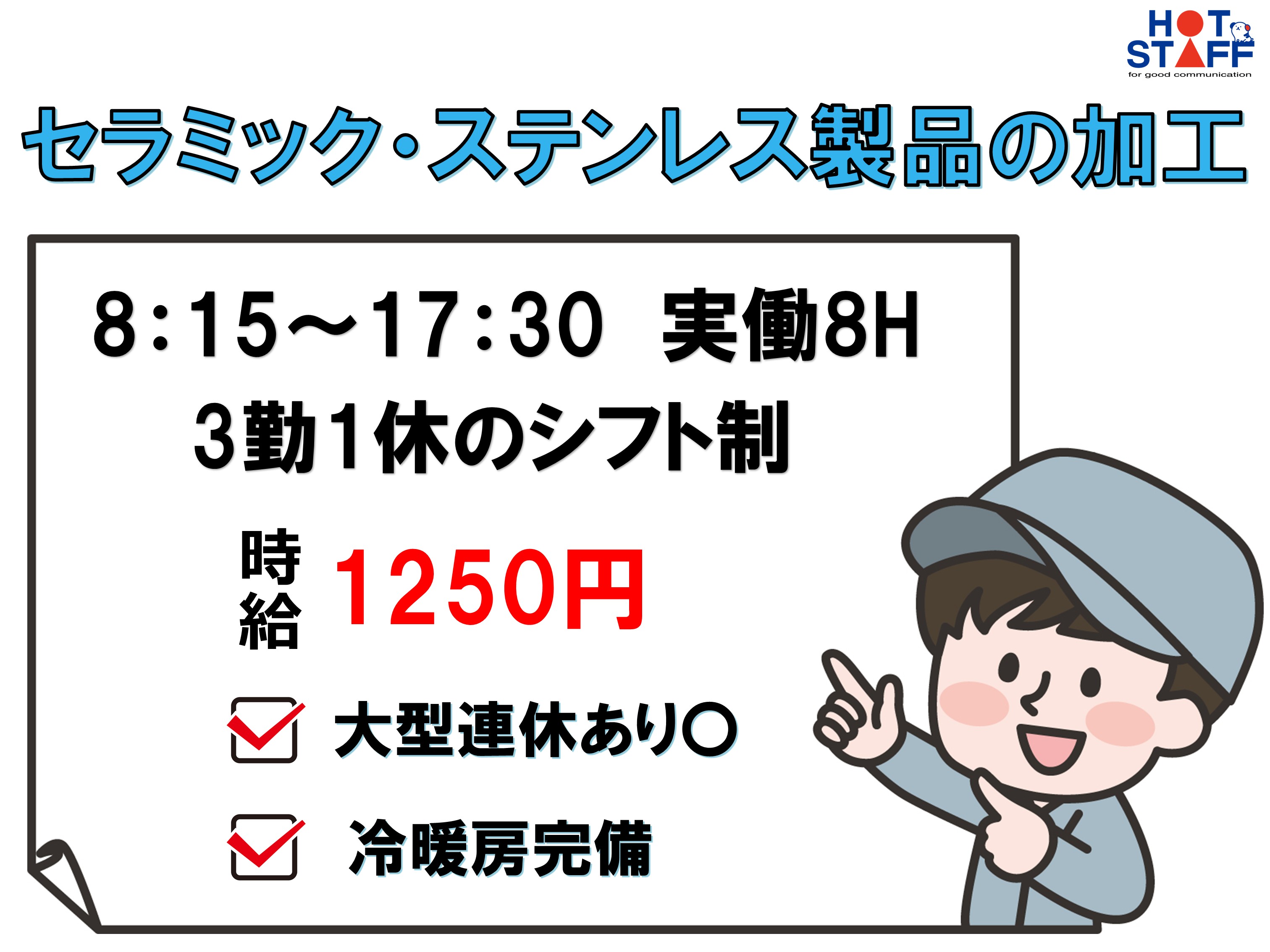 田野町×3勤1休/セラミックなどの加工業務!未経験OK☆手取り20万円以上可能!即日払いOK!