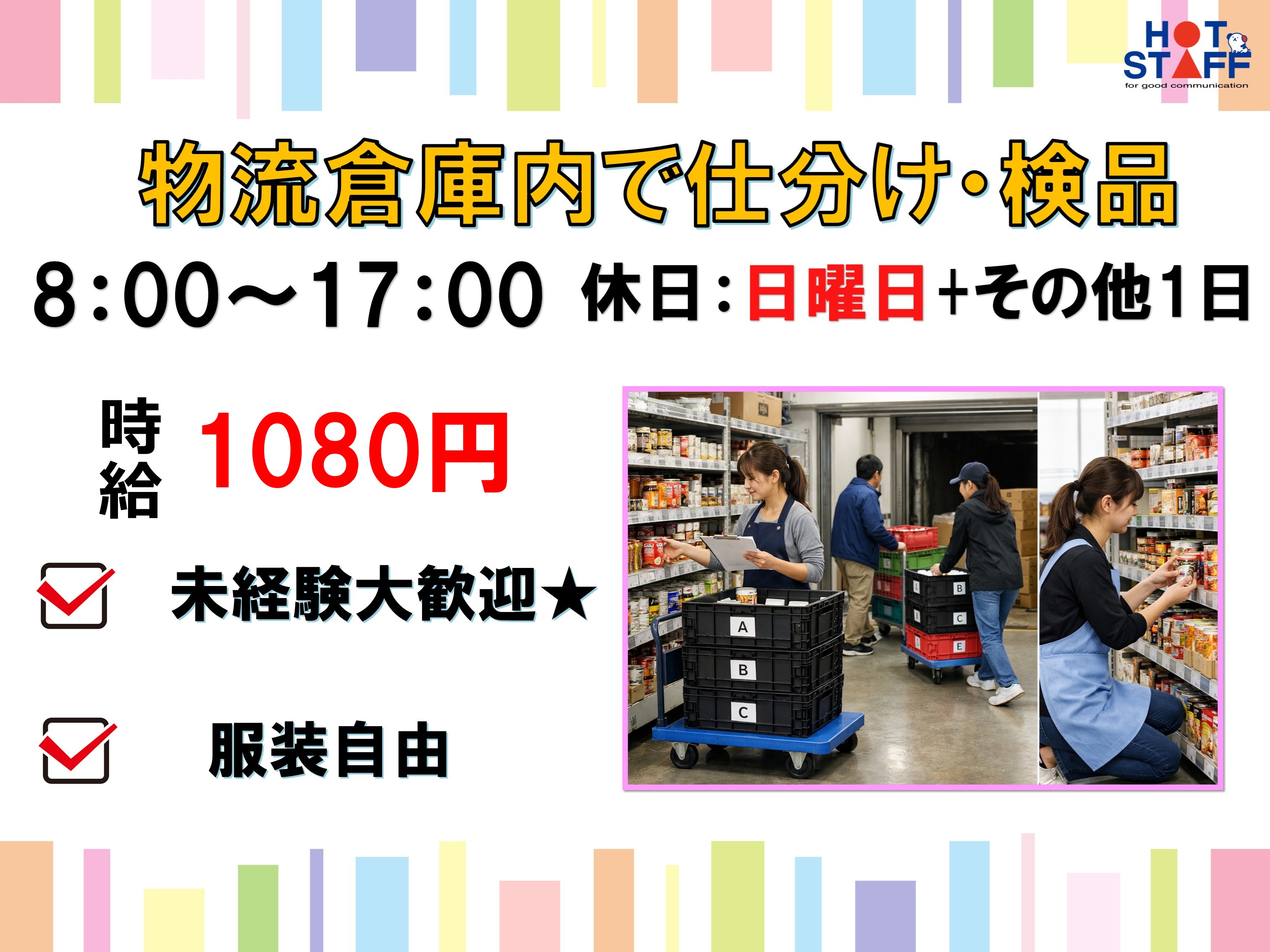 物流倉庫での仕分け・ハンディを使って検品作業・服装自由・日曜日固定休み★
