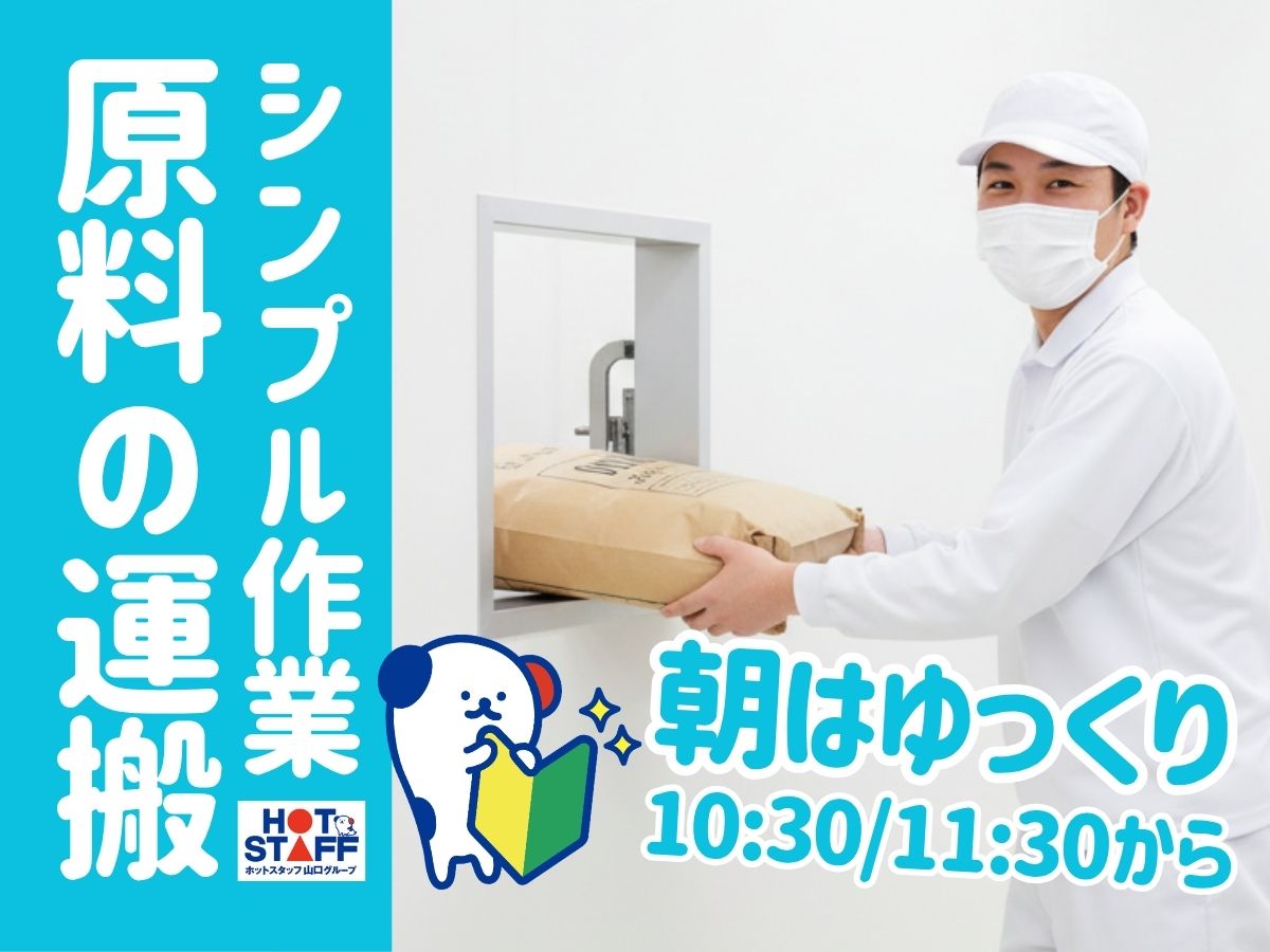 【土日祝休み】10時半~11時半出勤で朝はゆったり♪まるでバケツリレー?!食品原料の袋をモクモク運ぶ♪